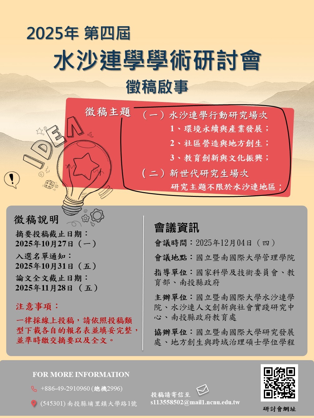 一律採線上投稿,請依照投稿類型下載各自的報名表並填妥完整(請掃描QR-Code),並寄信至s113558502@mail1.ncnu.edu.tw(廖同學),並準時繳交摘要以及全文。